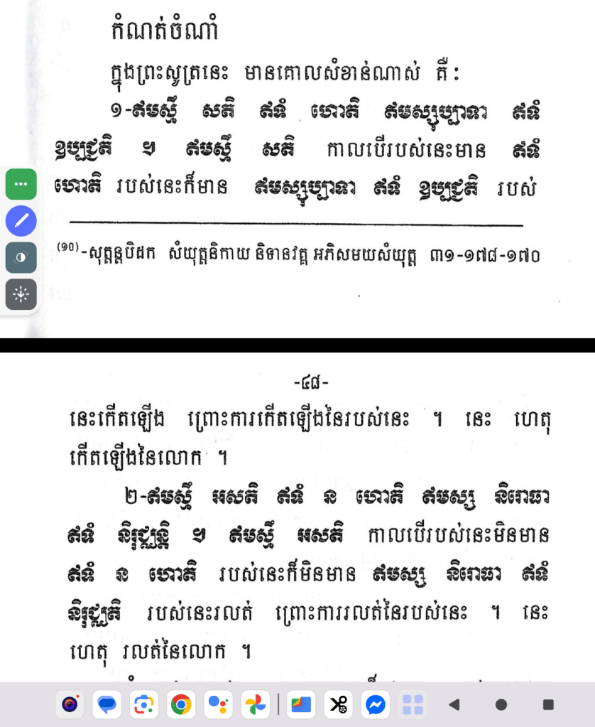 Traduction en françaisLes Conditions (Paccaya)Selon l’enseignement du Bouddha, les quatre conditions essentielles (paccaya) sont :1. La condition de l’ignorance — c’est lorsque la conscience naît dépendamment de l’ignorance.2. La condition des formations volitionnelles — c’est lorsque la conscience naît dépendamment des formations volitionnelles.Ceci est selon le commentaire du Paṭṭhāna dans l’Abhidhamma-piṭaka, pages 377–378.Explication supplémentaire :Lorsque l’ignorance existe, elle conditionne les formations volitionnelles. Lorsque celles-ci existent, elles conditionnent la conscience. Lorsque la conscience existe, elle conditionne les phénomènes mentaux et matériels.Cette chaîne de conditions interdépendantes est appelée Paṭiccasamuppāda, la loi de l’origine dépendante.