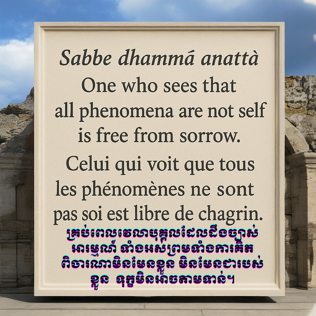ដកស្រង់គាថាដែលព្រះសាស្តាទ្រង់ត្រាស់ដឹង។អនិច្ចំ ទុក្ខំ អនត្តា ។។ ។ធម៌ទាំងឡាយមានហេតុនិងបច្ច័យ។ តើមានអ្វីពិតប្រាកដនៅក្នុងលោកនេះ បើយើងពុំបានពិចារណា នោះយើងឃើញថាមានរបស់របរាប់មិនអស់។