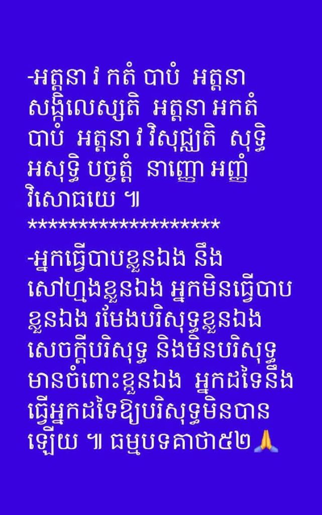 ដោយអំណាចកុសលដែលជាផលបុណ្យរបស់ខ្ញុំបាទ ពីអតីតជាតិនិងបច្ចុប្បន្នជាតិ សូមឱ្យសត្វលោកទាំងអស់ មានរូបក្តី អរូបក្តី  នៅក្នុងចក្រវាឡ យើងនេះសូមឱ្យមានសមាទិដ្ឋិដឹងនៅអ្វីជាគុណជាទោសជាអកុសល ជាកុសលទៅតាមសេចក្ដី ពិតដែលជាបរមត្ថធម៌ដែលព្រះពុទ្ធទាំងឡាយបានកសាងបារមីបញ្ញាបូជាពលិកម្មរហូតដល់ជីវិត ដើម្បីឱ្យសត្វលោកកុំឱ្យដើរខុសផ្លូវពី អដ្ឋង្គិកមគ្គ គឺមគ្គ អង្គប្រាំបីដែលមានតែព្រះពុទ្ធទាំងឡាយទេដែលអាចត្រាស់ដឹង